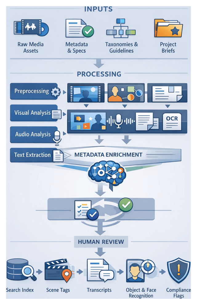 Validation routines compare incoming metadata against taxonomies and schemas, flag anomalies and infer missing values through pattern analysis. Assets with low confidence scores appear in review dashboards for human curation. Corrected examples feed back into model training, improving future inference accuracy.