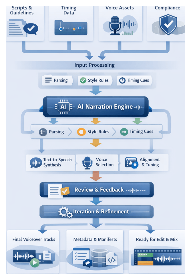 Copywriting modules suggest voiceover drafts. Upon approval, Adobe Sensei text-to-speech engines generate narration with controlled prosody. Tracks align automatically to visual cues, with versioning enabling auditions of alternative styles.