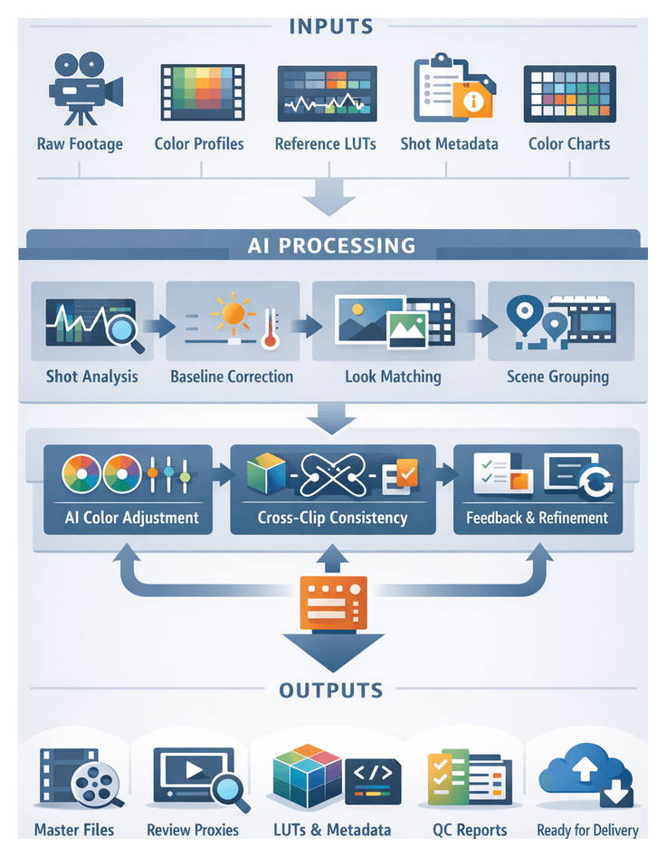 When models underperform—due to novel data or challenging conditions—workflows detect low confidence thresholds and revert to manual processes or template-only modes. Color grading engines apply baseline transforms when reference matching fails. Every fallback is logged for prioritizing model improvements.
