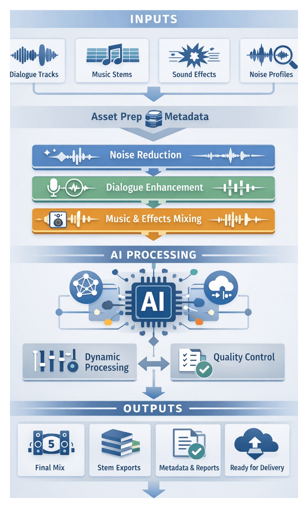 Deep-learning filters perform noise reduction, dereverberation and dialogue enhancement. Adaptive mixing algorithms balance stems to meet loudness standards. Editors preview mix adjustments in real time, and master stems carry metadata for broadcast and online platforms.