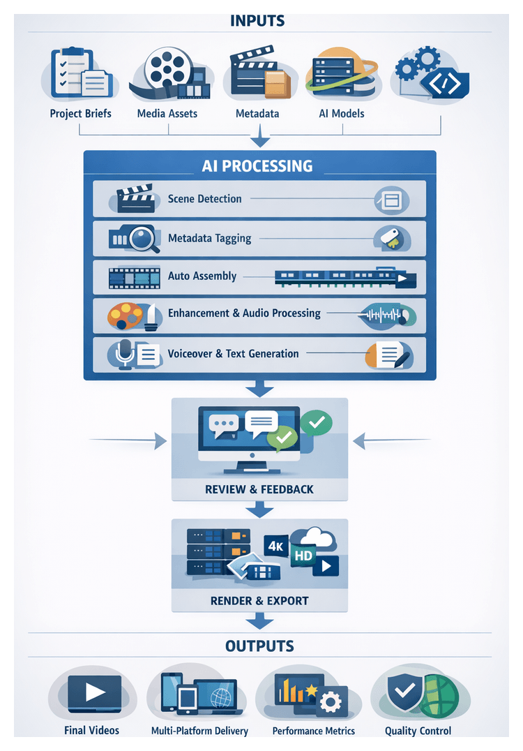 The end-to-end architecture decomposes into discrete stages with well-defined inputs, outputs and data contracts. Intermediate artifacts—planning documents, asset indexes, metadata catalogs, rough-cut timelines, voiceover tracks, graded clips, audio stems, review reports and rendered deliverables—propagate intelligence and structure downstream, reducing rework and ensuring traceability.