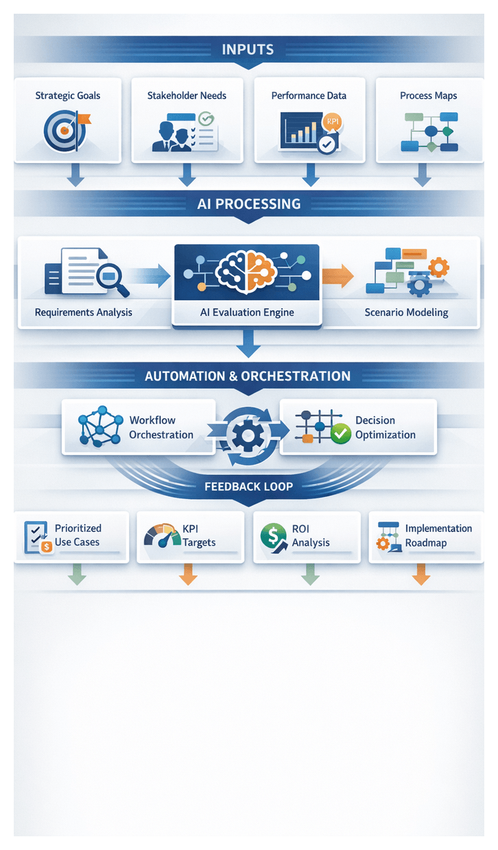 - Stakeholder Alignment and Vision Setting: Document high-level business objectives, ROI targets, process latency issues, success criteria, and governance models.