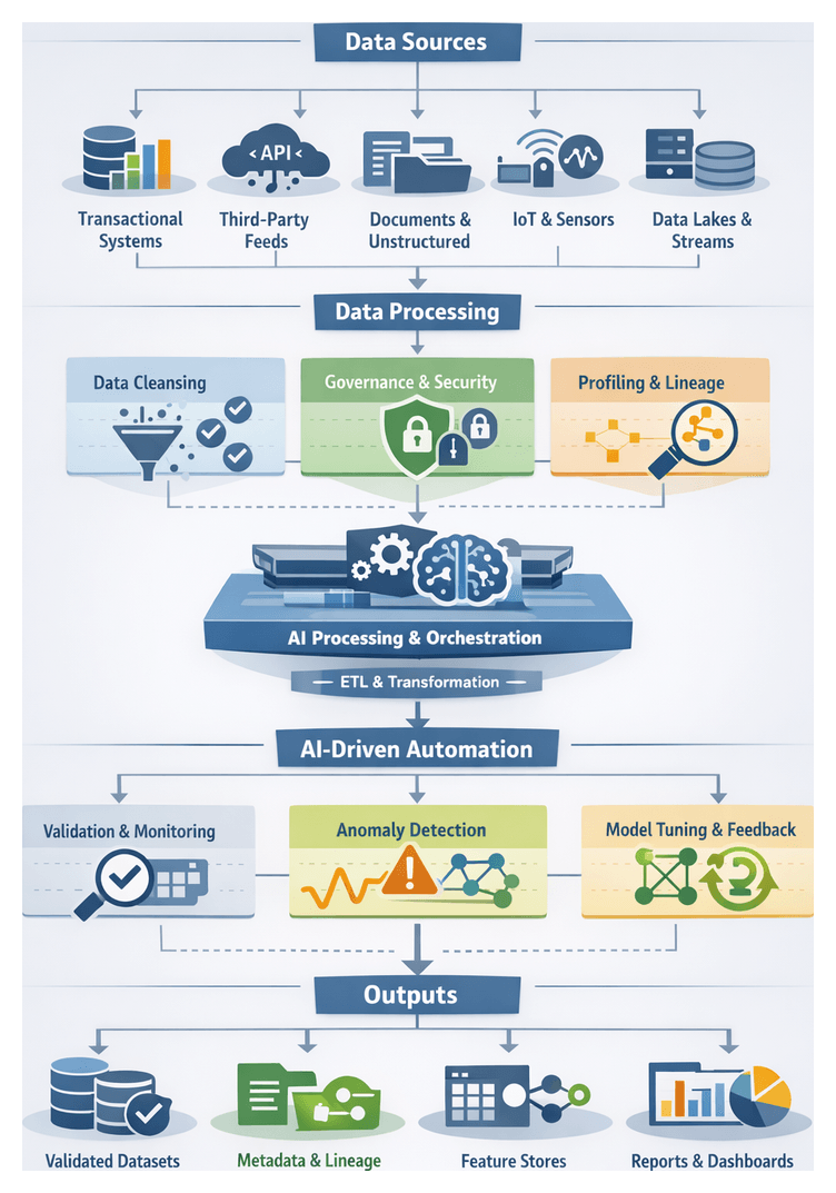 - Data Ingestion and Preprocessing: Extracts, cleanses, and normalizes data, applying anomaly detection and schema enforcement.