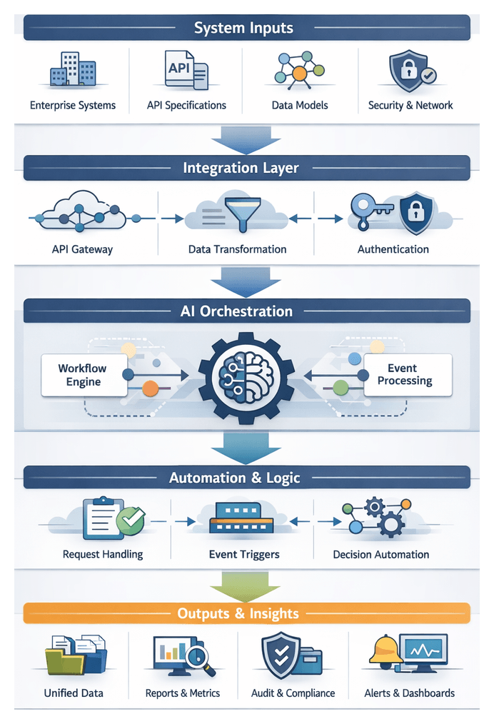 - Integration Connectors: Interface with external systems using REST APIs, message queues, or webhooks.