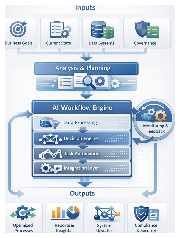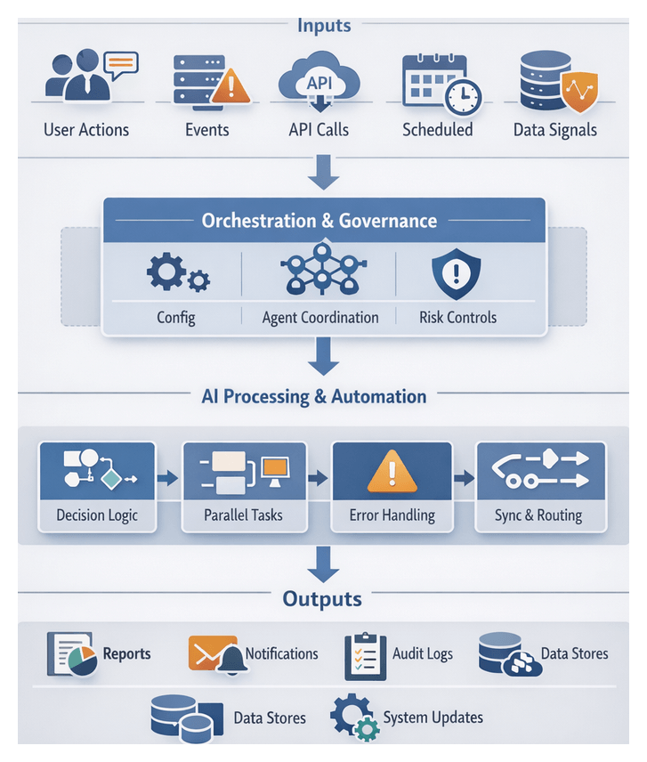 Workflows begin with trigger conditions—such as new data arrival, user requests, or scheduled events—and proceed through AI-driven analysis, data transformations, automated actions, and user interventions. Outputs may be delivered to end users, forwarded to other systems, or fed back to support continuous optimization. Key characteristics include clarity of inputs and outputs, defined decision points leveraging AI inference or business rules, explicit integration points with systems like Salesforce, SAP S/4HANA, or document management platforms, exception handling, and audit logging.
