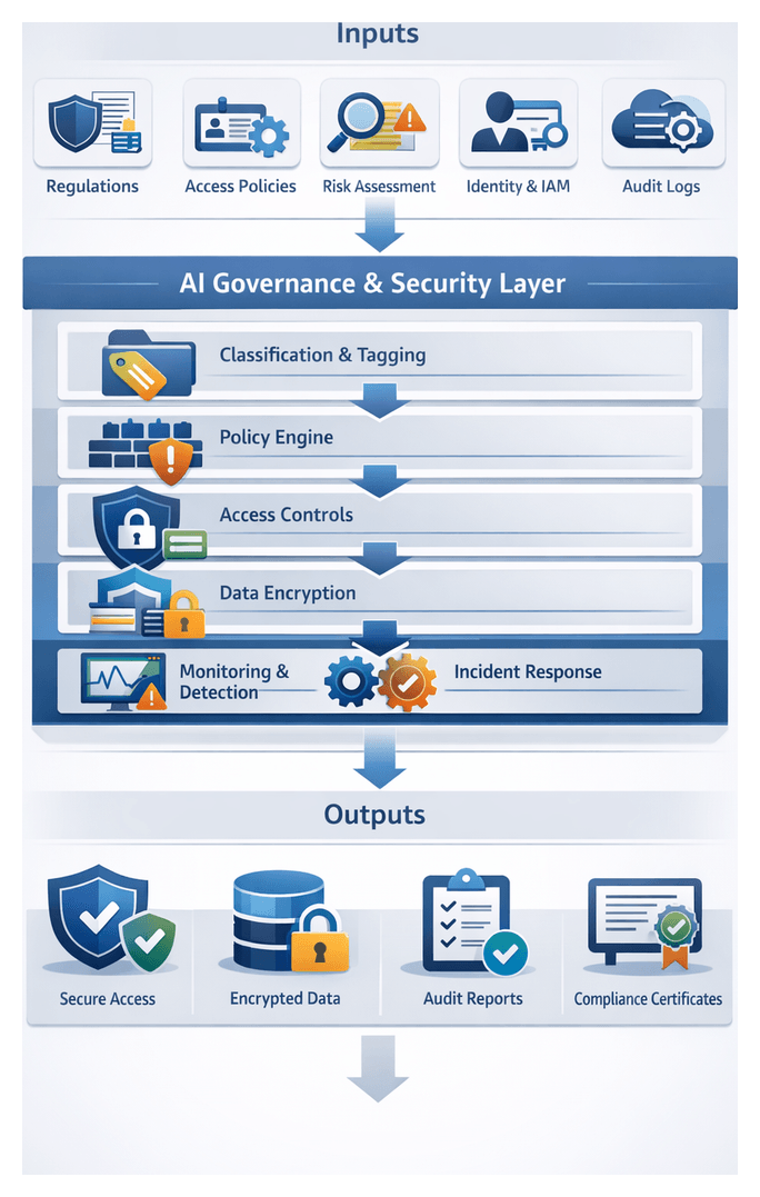 - Governance, Security, and Compliance: Define data stewardship roles, model governance procedures, risk assessment frameworks, audit trail requirements, and policy enforcement thresholds.