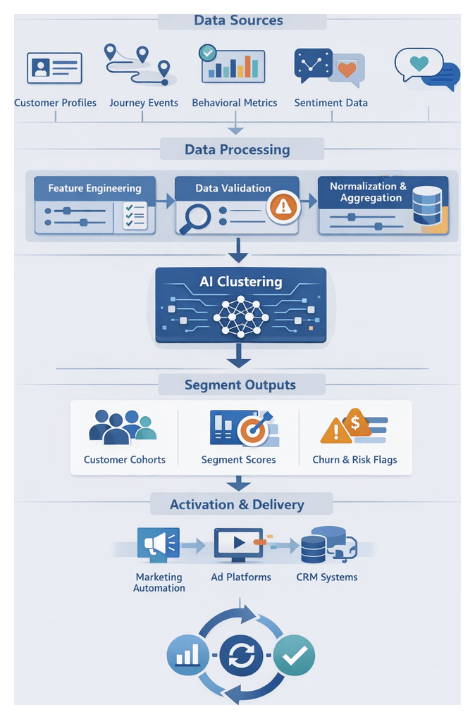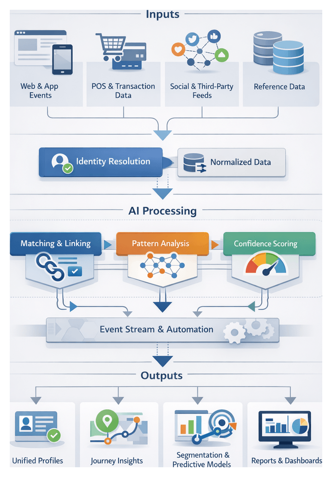 Identity resolution agents merge duplicates and reconcile identities across channels. Journey analytics reconstructs time-ordered interaction paths, highlighting milestones and drop-off points. Behavioral clustering and sentiment scoring identify customer segments, while predictive models score profiles for churn risk, lifetime value and next-best actions.