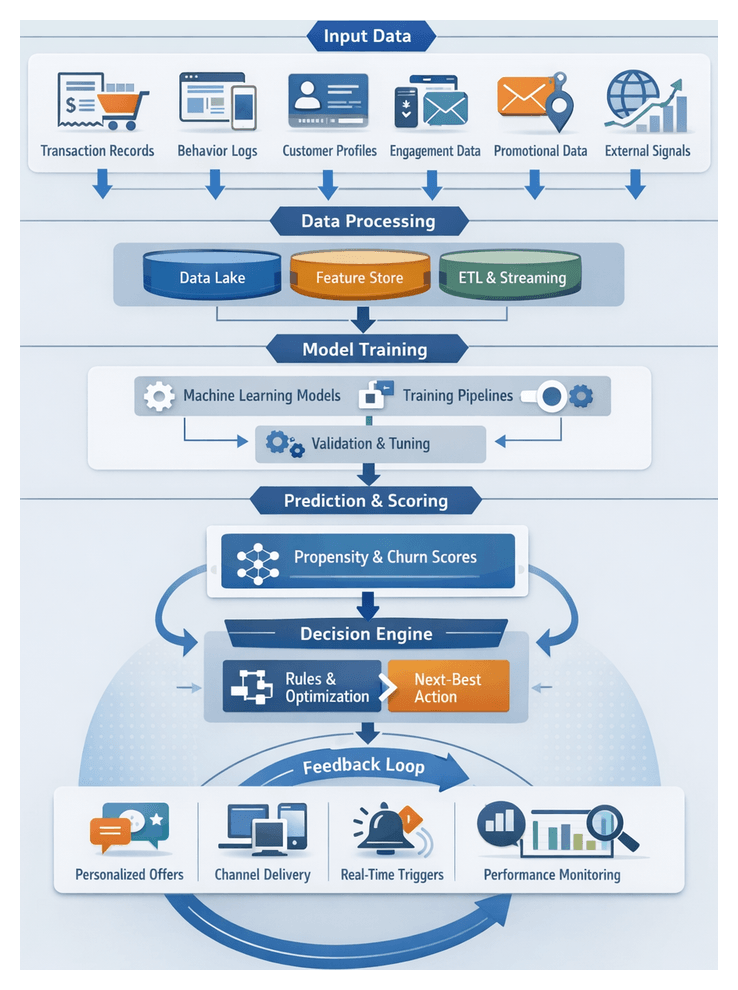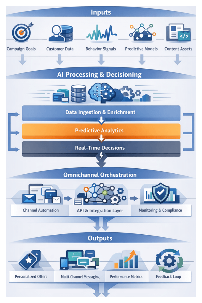 Decision engines and automation pipelines coordinate campaigns across channels and triggers.