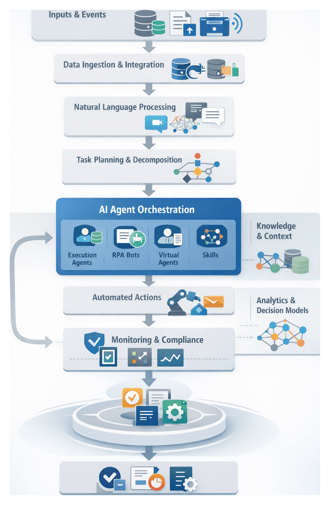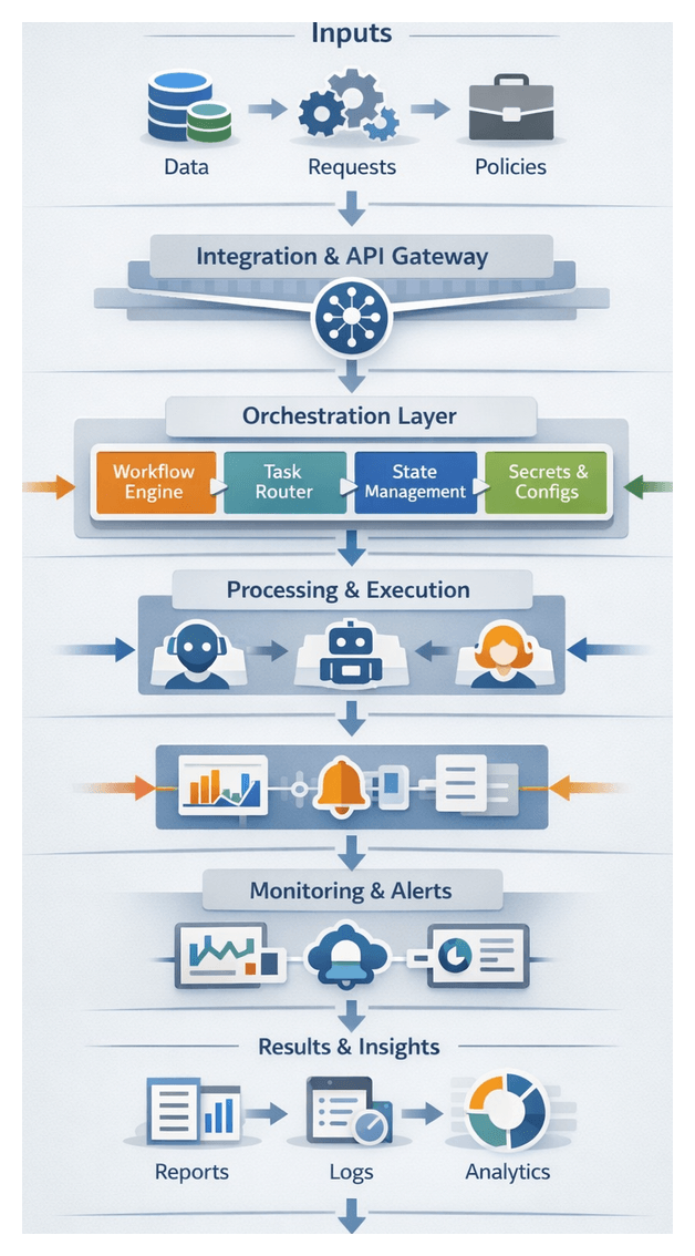 - Exception Handling: Standardized error schemas, retry policies, and escalation protocols within the orchestration layer.