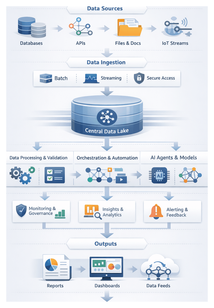 - Data Platforms and APIs: Data lakes on Amazon S3 or Azure Data Lake Store, real-time streaming with Apache Kafka, and API gateways exposing master data and business logic.