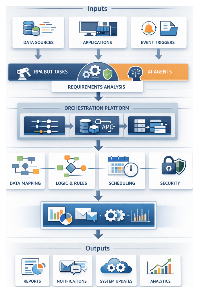 - RPA Agents: Bots interfacing with legacy systems via UI automation or APIs, deployed through UiPath or Automation Anywhere.