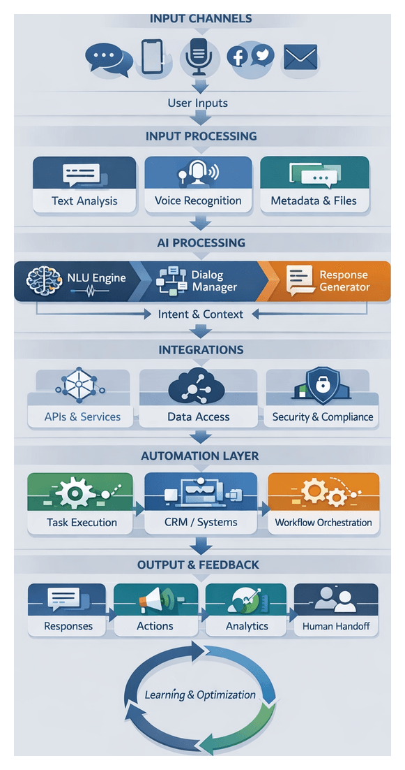 - Virtual Agents and Chatbots: Conversational interfaces for user queries, escalating to humans when needed.