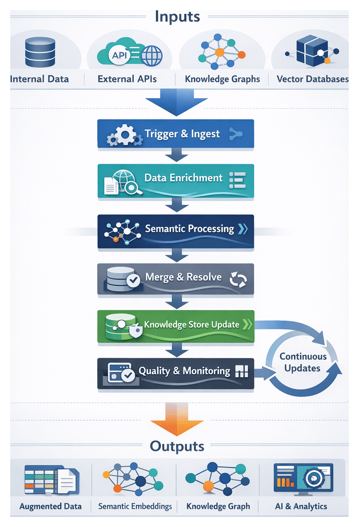 - Data Stores and Knowledge Repositories: Databases, data lakes, and semantic stores housing structured, unstructured, and enriched content.