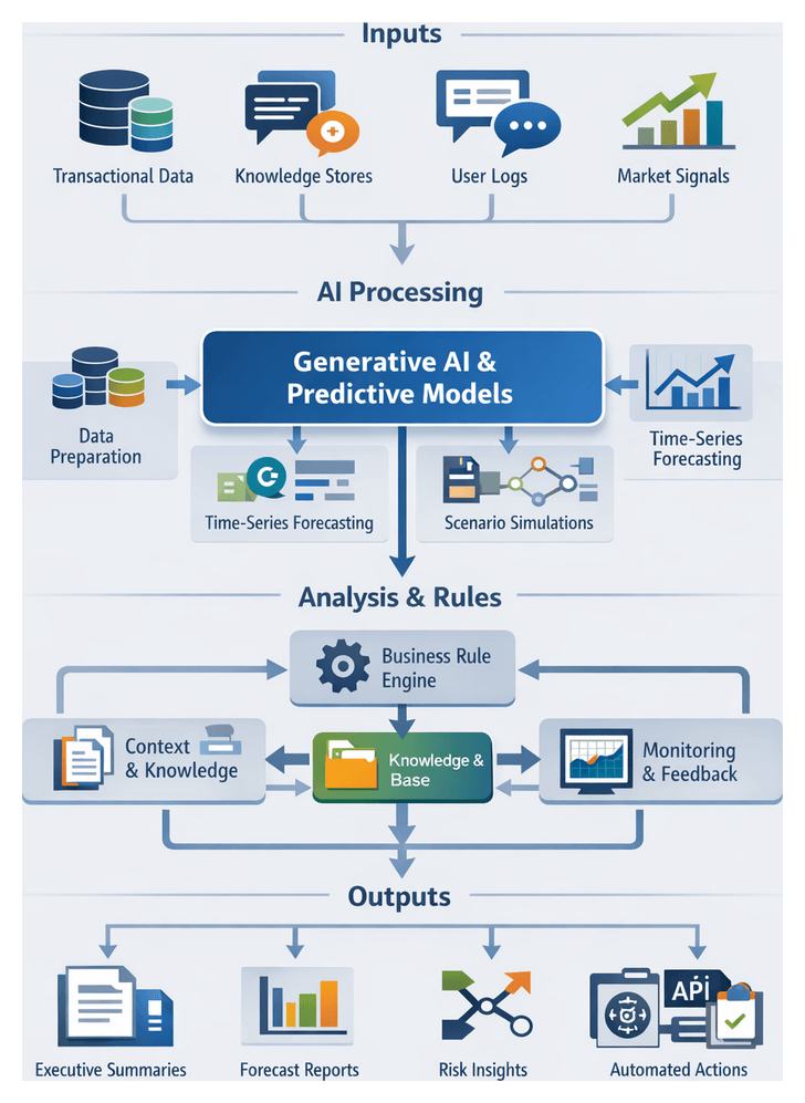 - Generative AI: Large language models such as OpenAI’s GPT and Azure OpenAI draft text, generate code snippets, and propose strategic scenarios.