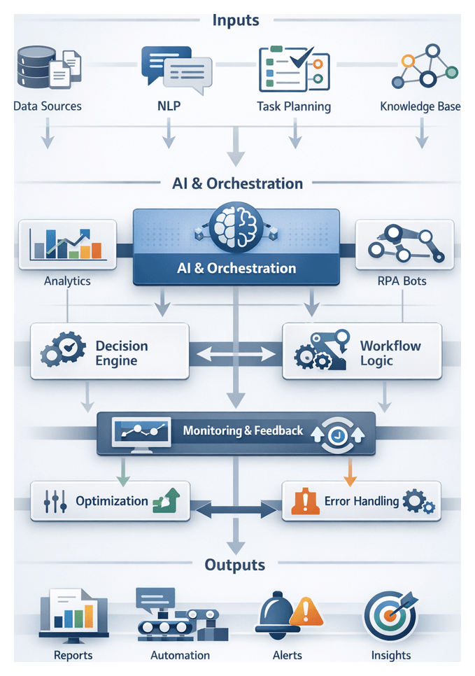 Embedding AI agents into orchestration layers transforms static pipelines into adaptive, intelligent workflows. These agents leverage machine learning models, natural language understanding, robotic process automation, decision-support systems, generative AI, and computer vision to automate tasks, collaborate with humans, and self-optimize.