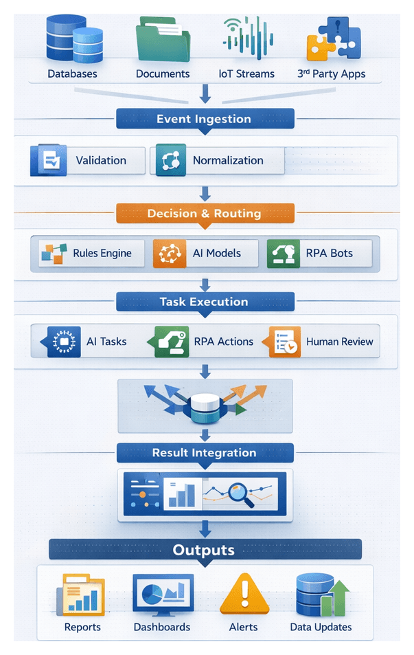 - Task Dispatch: Jobs queue or invoke AI inference endpoints, RPA bots, or human task portals.